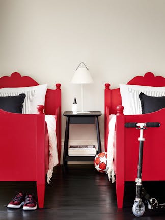 创建一个充满活力的方案,非常适合通过将“红色斗篷”家具与绝对黑色的“杰克·布莱克”相结合,非常适合儿童卧室。