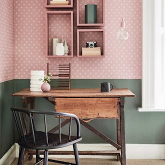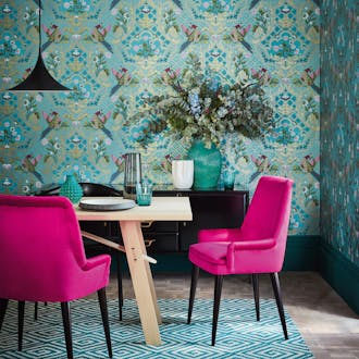 基于18世纪初的法国纺织品,包括卷轴和交叉孵化 - 该图案最初是为模仿皮革的。不寻常的是,它在反面颜色的布罗德斯沃思大厅的图书馆和晨间房间都被使用。