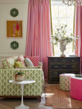 在这些尊贵的客厅里,我们的多才多艺熟石灰深提供了一个平静的背景,在此基础上进行色彩和图案的实验。大胆的粉色窗帘和别致的费尔福德绿色沙发采用了经典的色彩组合莫斯色彩设计。