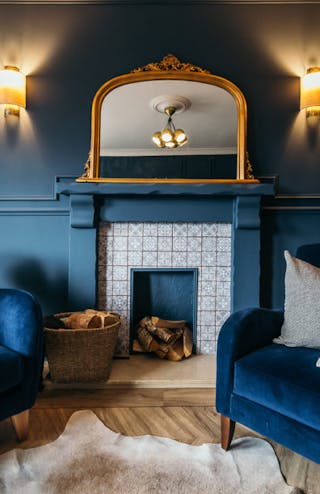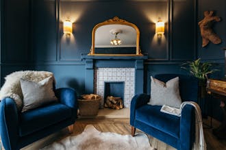 创建一个完整的,包罗万象的色彩浸透的外观。色彩浸染是把你房间里的所有东西都涂成一种颜色的过程。比如,天花板上有希克斯的《绝对马特的蓝色》,墙上有希克斯的《智能马特的蓝色》,墙裙和裙摆上有希克斯的《智能绸缎的蓝色》。