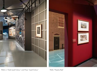 位于索尔福德码头的博物馆选择了大胆的小格林色调作为展览的背景,包括欧宝体肓app黑灯228,Clay Pale 152,灰蓝绿色226和原子红190.