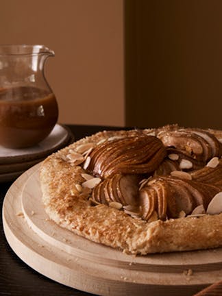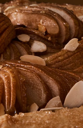 - Combine the ground almonds and cornflour for the filling in a bowl. Leaving a 2-inch (5cm) border, scatter the almond mixture over the pastry. Thinly slice the pears and fan the slices over the pastry in your pattern of choice, then fold the pastry border over the tart, letting the pastry overlap where this happens naturally. Combine the honey and lemon juice and brush this mixture over the pears. Chill in the fridge for at least 30 minutes before baking.