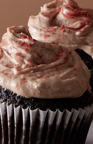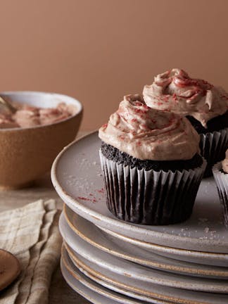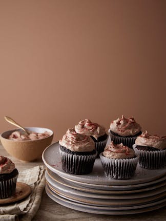 4. To make the icing, beat the butter and 150g icing sugar in the bowl of an electric mixer or with a handheld whisk, until smooth. Slowly add the cream cheese and the rest of the icing sugar with the cocoa powder. Loosen the jam with the lemon juice and pour ¾ of the mixture into the icing. Roughly fold through the remaining jam, leaving a rippled effect and use to top the cupcakes. Decorate with a sprinkling of dried raspberry powder, if preferred.