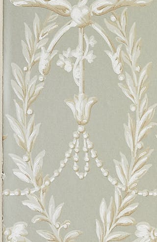 A classic interpretation of this pattern, so typical of French wallpaper panels produced by the manufacturer Réveillon from the late 1700s onwards. The design was block-printed in eighteen colours on a narrow 18.5” (47cm) width paper with a vertical repeat of 26.5” (67cm). The original design scale, style and surface treatment have all been maintained, embracing floral bouquets and garlands with drapery and arabesque decoration.